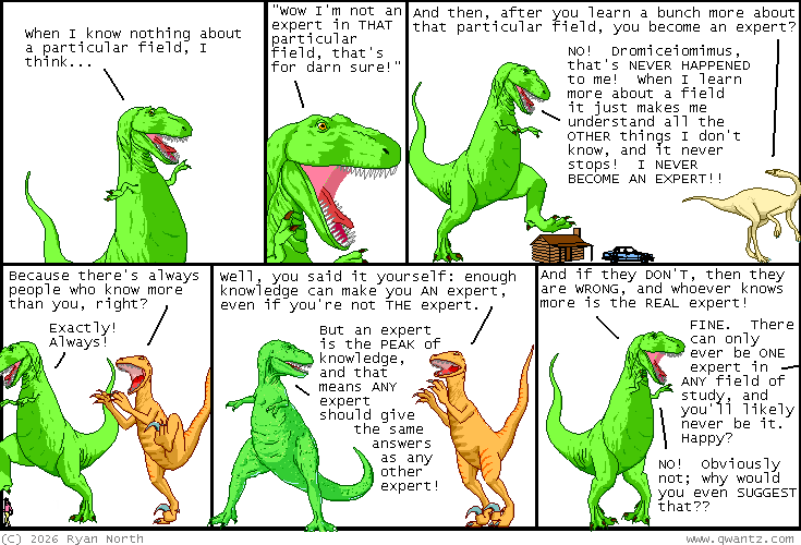 T-Rex: NO! Dromiceiomimus, that's NEVER HAPPENED to me! When I learn more about a field it just makes me understand all the OTHER things I don't know, and it never stops! I NEVER BECOME AN EXPERT!!