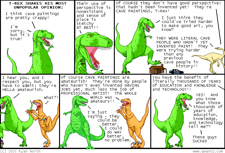 Utahraptor: Of course CAVE PAINTINGS are amateurish! They're done by people who haven't even invented HAVING JOBS yet, much less the job of PROFESSIONAL ARTIST! The WHOLE WORLD was amateurs!!
