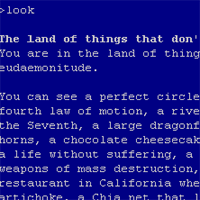 Ryan says: Nick submitted two versions: the first, and a "bug fix" in which one can no longer interact with the last digit of pi that doesn't exist. I think both are pretty surreal! You'll need a ZMachine interpreter such as WinFrotz (Windows) or Zoom (Mac) to play, OR, you can message user "rodnuk" the phrase "ttde" on AIM to play over instant messanger!